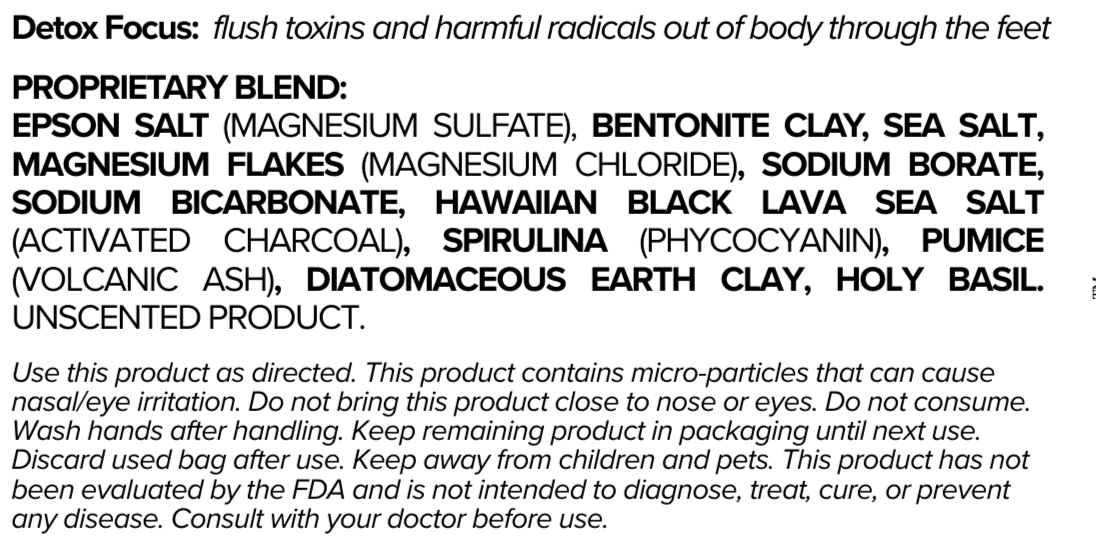 Proprietary Blend: Epsom Salt (magnesium sulfate), Bentonite Clay, Sea Salt, Magnesium Flakes (magnesium chloride), Sodium Borate, Sodium Bicarbonate, Hawaiian Black Lava Sea Salt (activated charcoal), Spirulina (phycocyanin), Pumice (volcanic ash), Diatomaceous Earth Clay, Holy Basil.